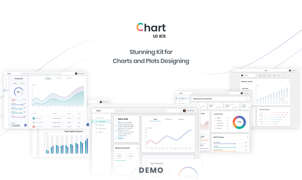 Create elegant and modern design of Admin Panels, Dashboards, Infographics and Analytics software (finance, e-commerce, bitcoins). Chart Kit collection contains all the most popular types of graphs and diagrams — just select ones you need and combine with your UI design.